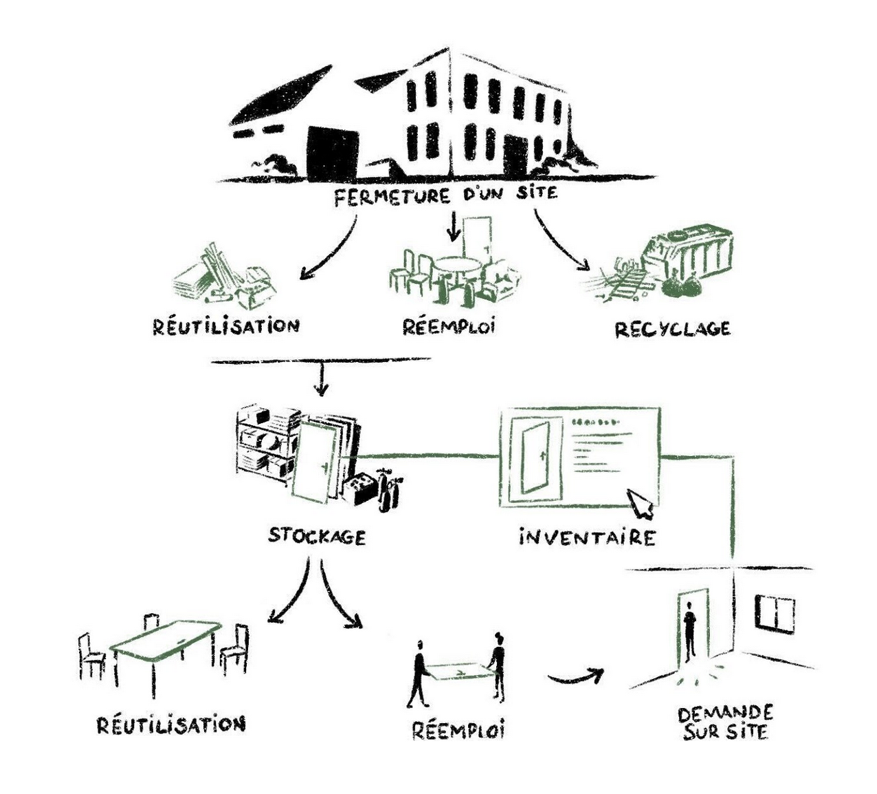 Chaîne de réemploi de la fermeture d’un bâtiment à la réutilisation ou au réemploi de matériel. © Plateau Urbain