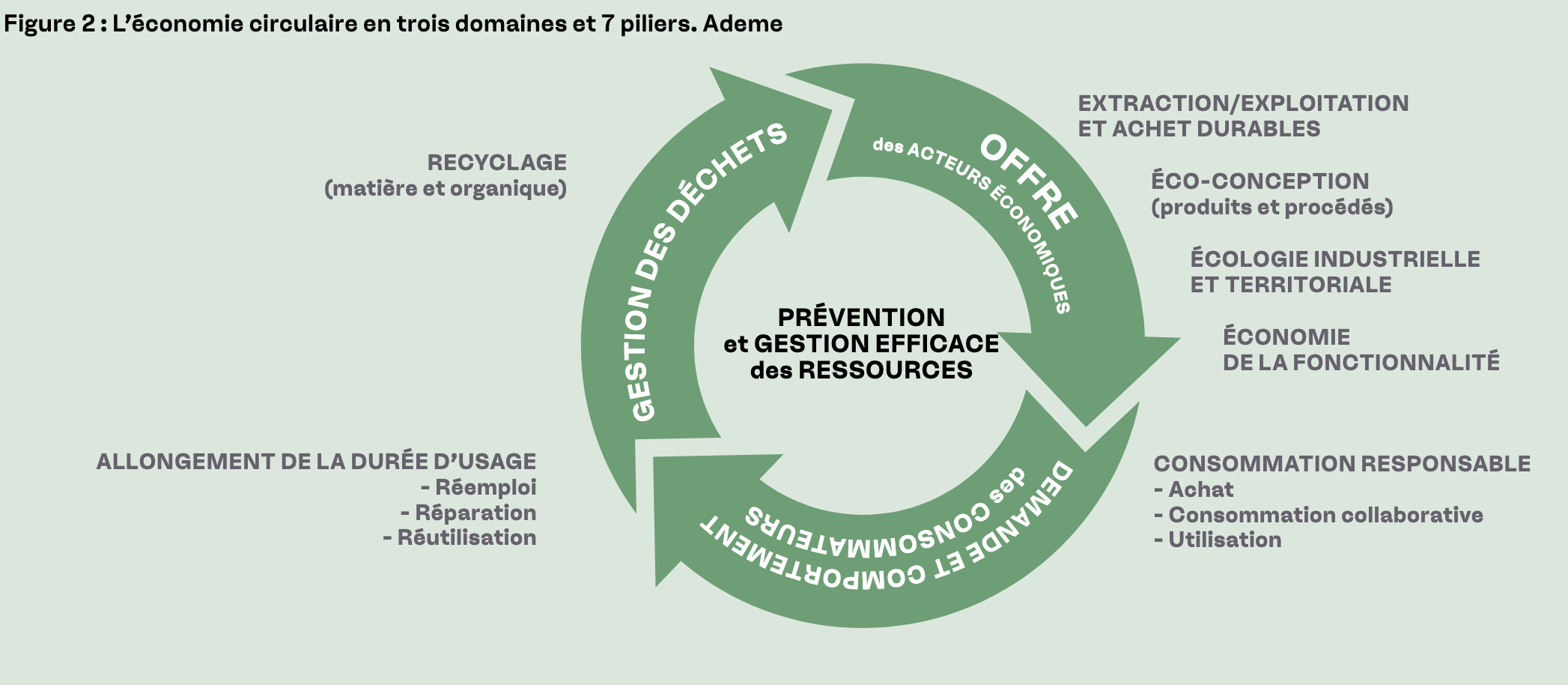 Troisième dimension de notre volet environnemental, l’économie circulaire s’articule traditionnellement autour de trois grands domaines d’action : l’offre des acteurs économiques, le comportement des consommateurs et la gestion des déchets. Chacun de ces domaines repose sur des pratiques spécifiques, elles-mêmes guidées par sept piliers définis par l’ADEME (cf schéma ci-dessous). Ces piliers complémentaires constituent autant de leviers pour favoriser une meilleure gestion des ressources et une réduction de notre impact environnemental.